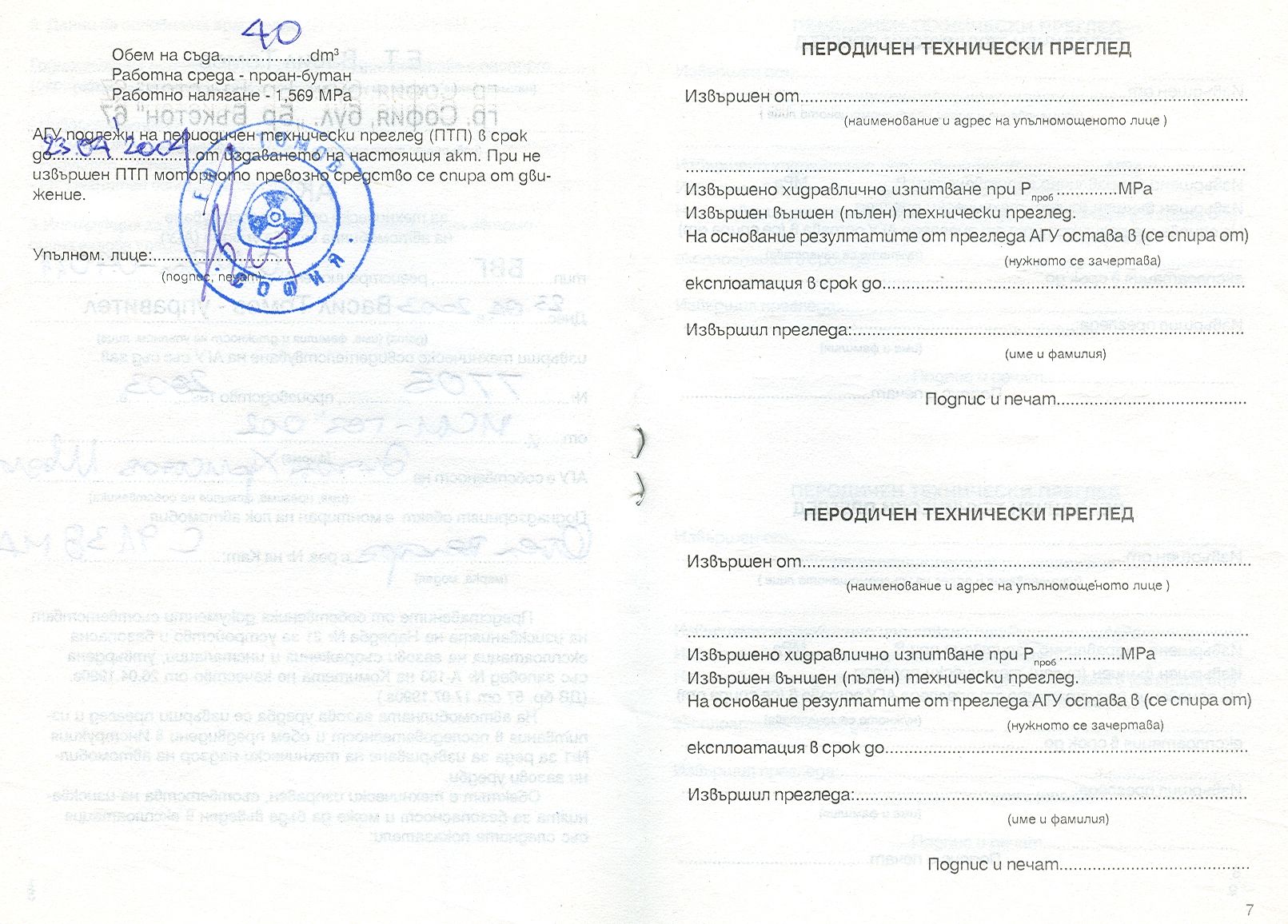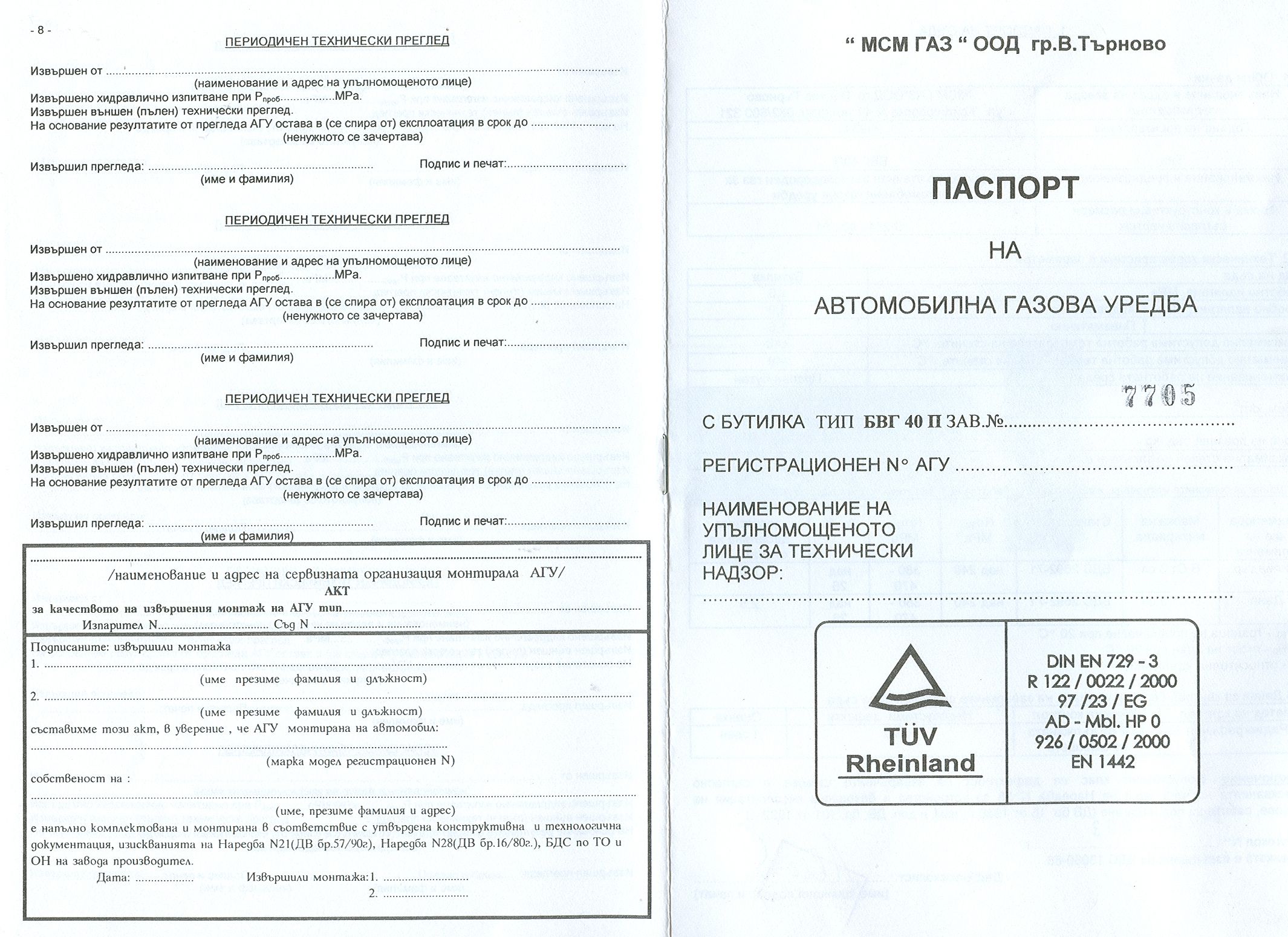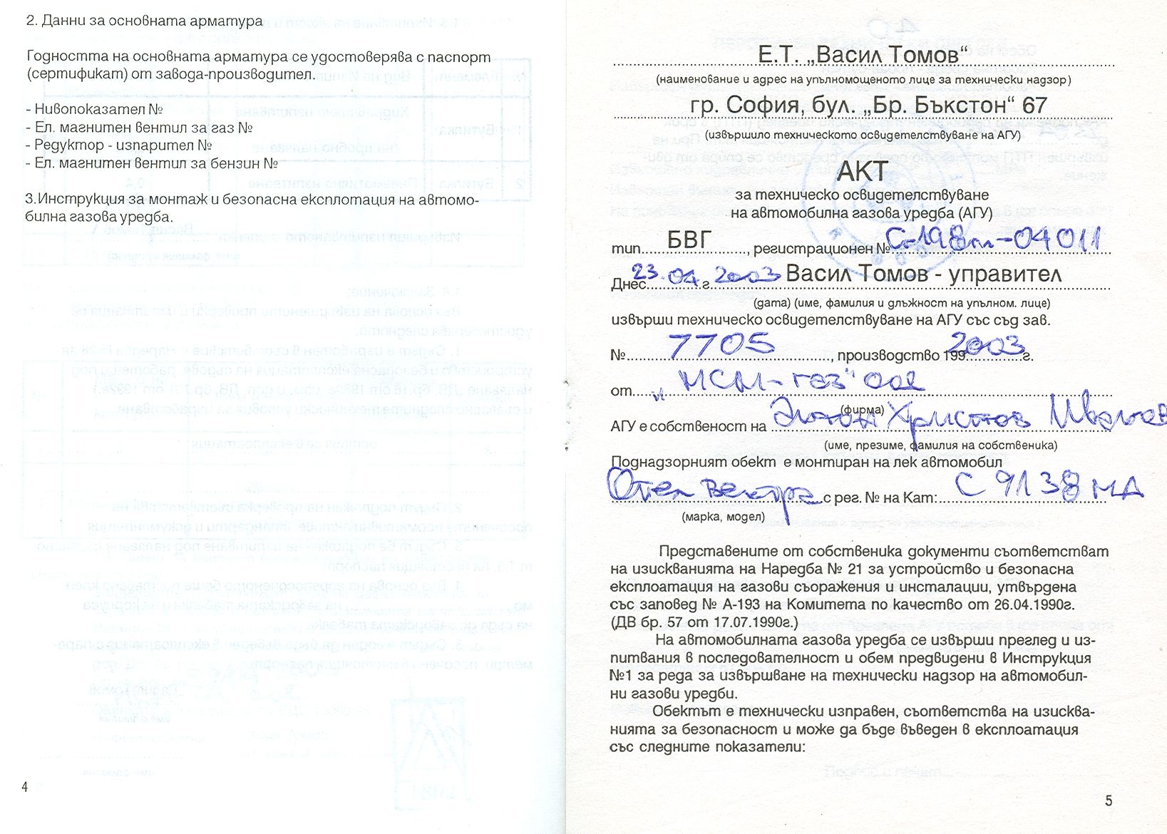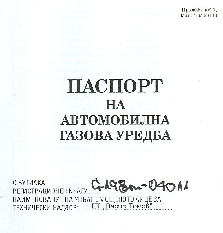 На снимките ще видите документите на автогазовата уредба, на бутилката и на изпарителя. Изпарителят си беше перфектен, ама при удара са се отчупили пластмасовите стърчащи от него части. Т.е. нужен му е малко ремонт.